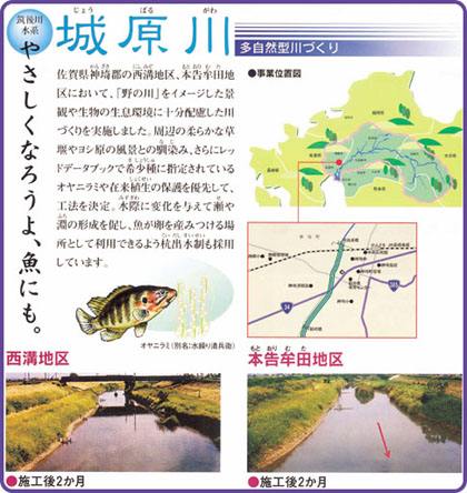 工事現場には 「やさしくなろうよ。 魚にも」 と標語をかかげ、 通学路にある現場事務所には城原川の野草や魚を展示した。