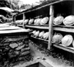小鹿田焼きは朝鮮伝来の技法を受け継ぐ窯場だが、陶土を砕く唐臼も朝鮮伝来のもので、今はここ小鹿田窯独特の風物詩となっている。決して見せ物ではないのだ。 そしてこの唐臼こそが民窯小鹿田焼きの要なのである。工人が働くことを怠ればこの唐臼が急き立てるし、唐臼をおろそかにすれば機械がはいって来る。また唐臼が創り出す陶土量が、家族で働く手仕事にバランスして、この体型を崩さなかった故に、小鹿田窯の伝統は守られて来たのだといっていい。